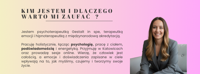 Jestem psychoterapeutką Gestalt in spe, terapeutką emocji, coachem ICF, hipnoterapeutką z międzynarodową akredytacją, która pomaga kobietom ogarnąć emocje, budować pewność siebie, stawiać granice i wreszcie – żyć w zgodzie ze sobą. Od lat towarzyszę ludziom w pracy z emocjami – szczególnie z lękiem, napięciem i wewnętrznym krytykiem. Wiem, jak bardzo potrafią one ograniczać codzienne życie, odbierać energię i radość.